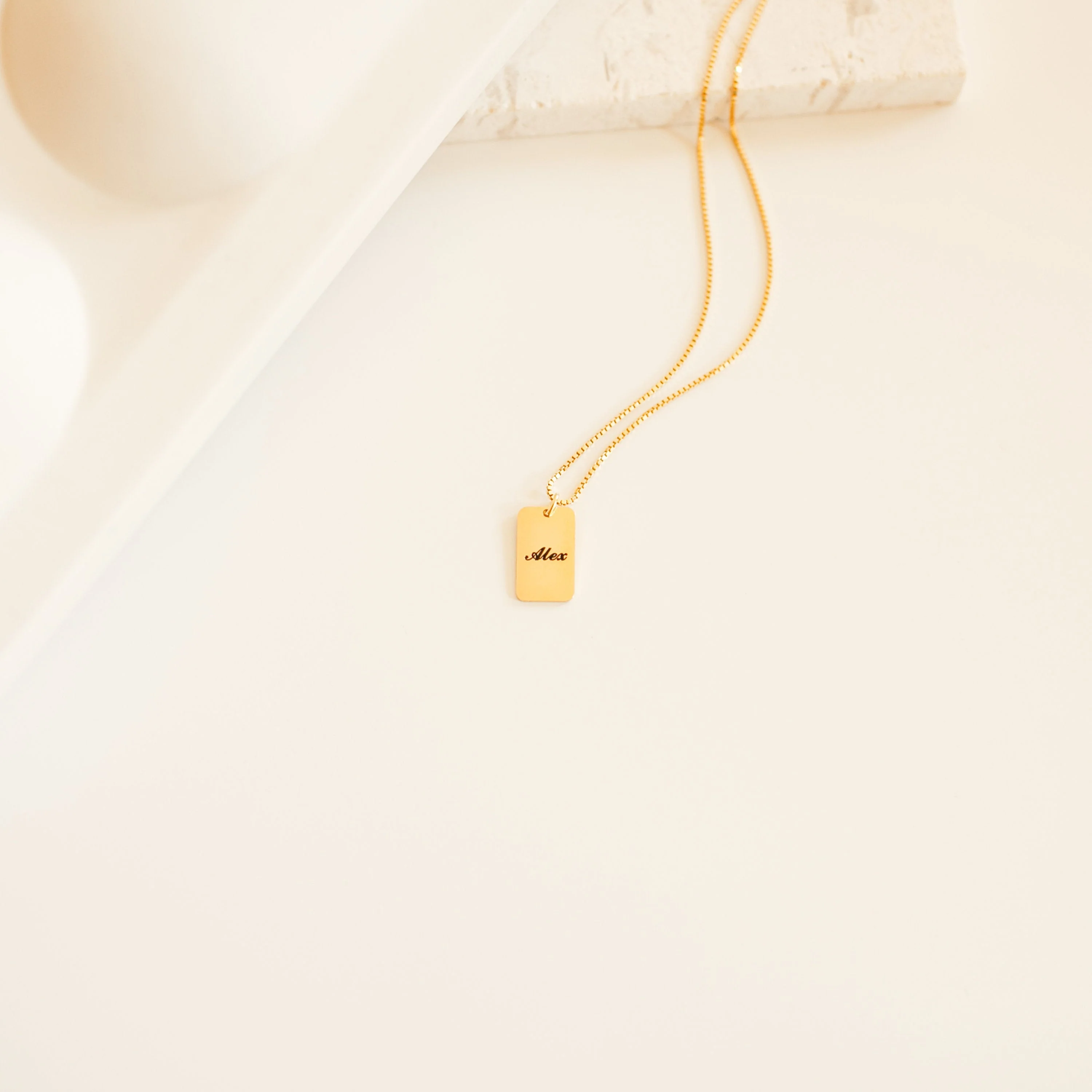 The Name Tag Necklace is a modern and sleek take on personalized name jewelry. The loved polished tag adds a sleek and elegant sheen to your look, and the delicate name engraving makes it the prettiest way to introduce yourself to a room of new people.