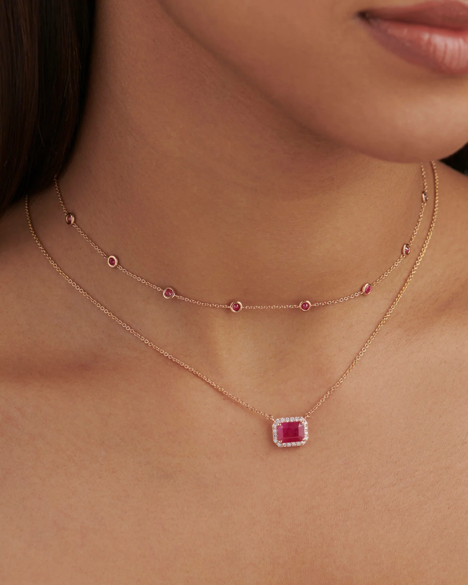 Embellish this symbol of passion, protection, and wealth. A timeless opulence, this octagon-cut red ruby necklace features an eye-catching natural ruby with pave halo diamond.